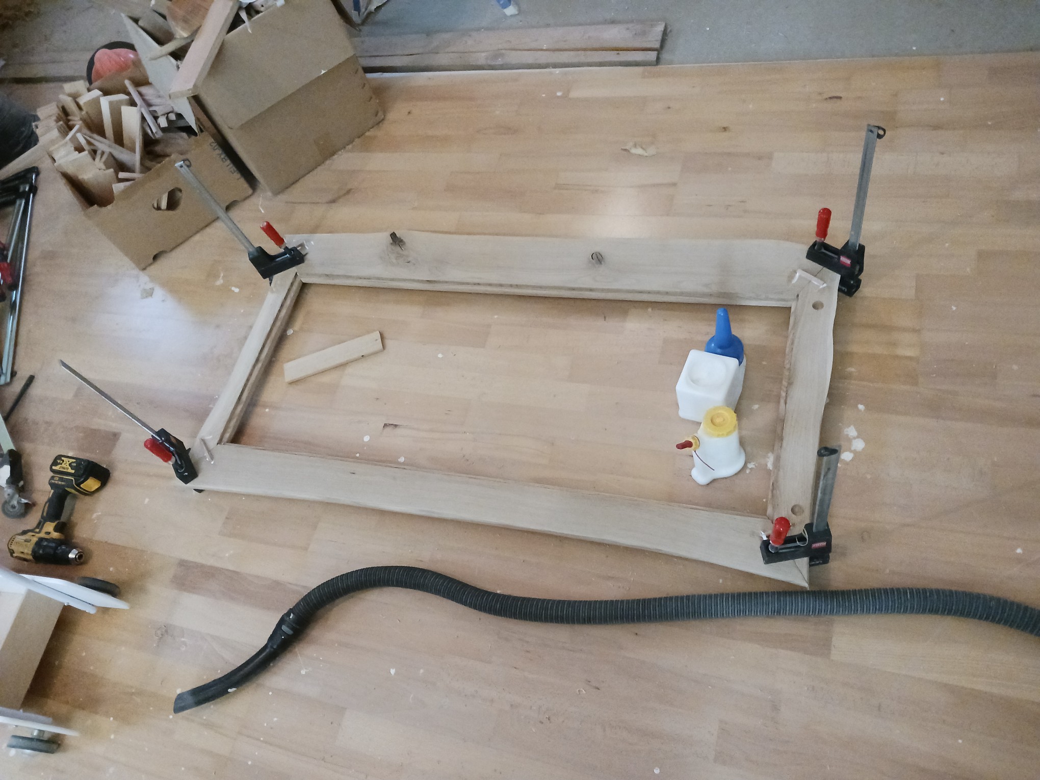 As my unfinished projects piled up, and with the mirror being something we needed at home, I decided to tackle it again. I joined the boards using a simple butt joint and wood glue. Once that set, I created channels for reinforcement sticks using a router and the now-available table saw.