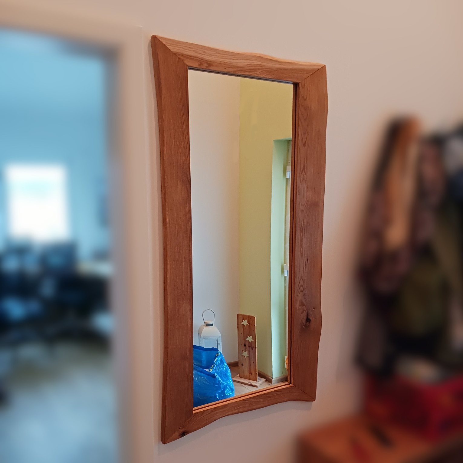 After sanding and applying two coats of hardwax oil, I finally mounted the mirror on the wall. It’s securely held in place by two hooks on the top and one hook in the middle on the bottom. Now, our house feels complete with the addition of this DIY wall mirror.