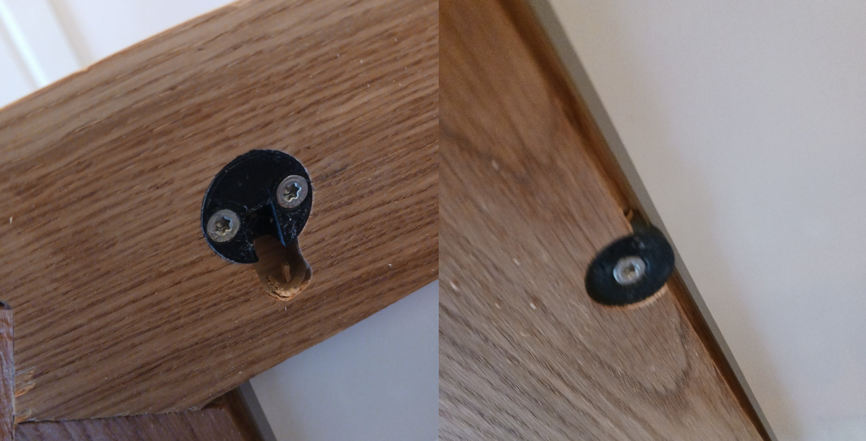 To hang the mirror on the wall, I drilled a 22mm hole with a forstner bit and designed a 3D-printed holder to screw in place. You can download the design files here; they’re made using openscad, which is straightforward for me as a software developer. Alternatively, the holters can easily made out of round stock wood.